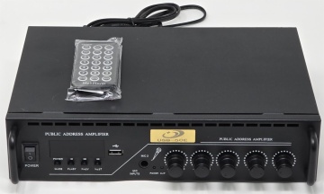 Item Code:USB-50E Features:Model:USB-50E MINI PA PRE AMP 50 W *1 line inputs . *1 Mic input. 1 AUX Output . *Treble and bass controls *Output : 4-16ohm/70V/100V *With USB/SD/FM/BT and screen . *Output : 4-16ohm/70V/100V *Dimensions(WxDxH) 280*200*65MM *Box packing :320*245*105MM *Carton packing :520*335*445MM/8 PCS